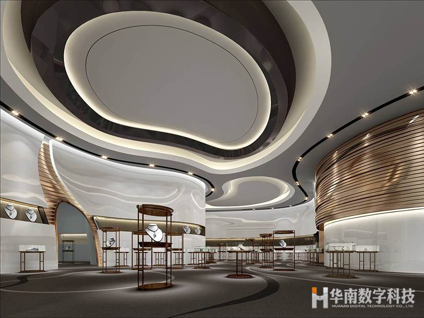 深圳羅湖珠寶展示中心總面積約1000平米,造價約一千萬。是海內(nèi)公認(rèn)的珠寶首飾制造生產(chǎn)中心和交易中心,本案的珠寶展示展廳設(shè)計靈感來源于寶石的形態(tài)以及女性的柔美,韻律流暢的線條為展示展廳賦予了時尚的格調(diào),同時以不同的質(zhì)感純凈的白為空間底色,煙粉明黃,藍(lán)色等點綴其中,打造夢幻輕奢的氣質(zhì)。華南數(shù)字科技在設(shè)計展示展廳本項目時,更能從消費者角度出發(fā),用消費者的眼光以設(shè)計之手法傳遞共情。